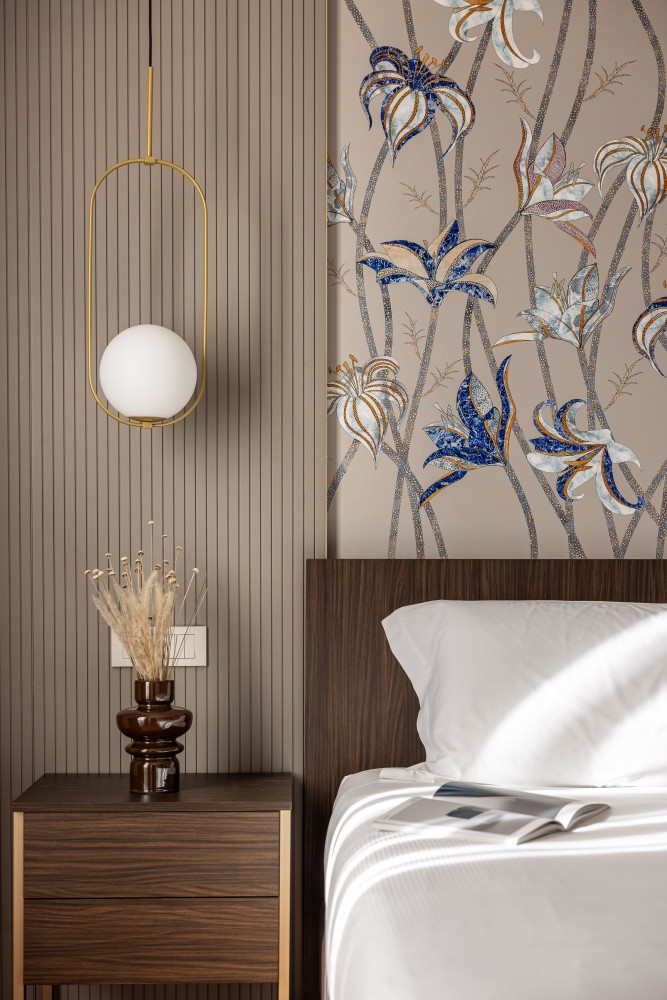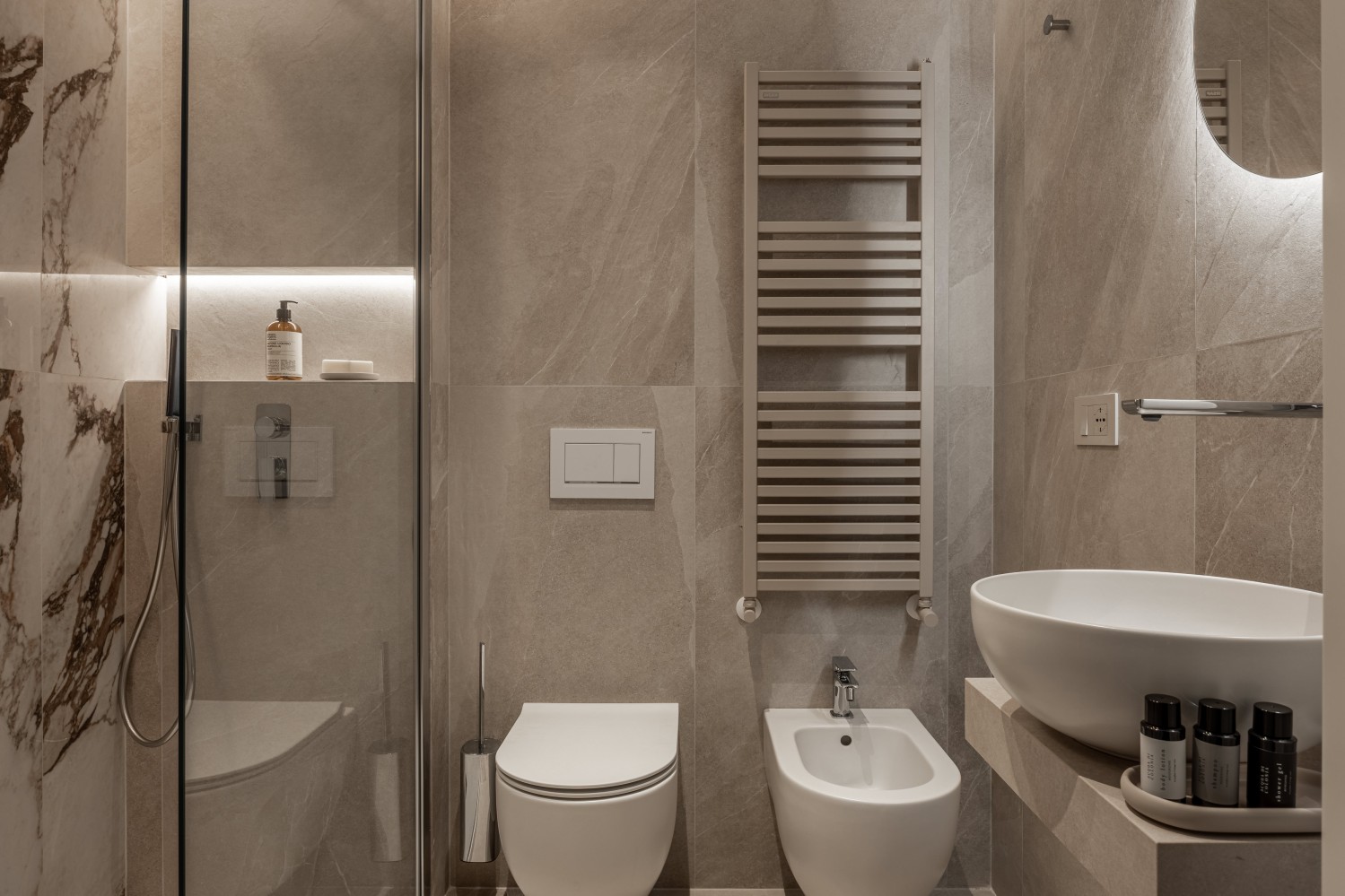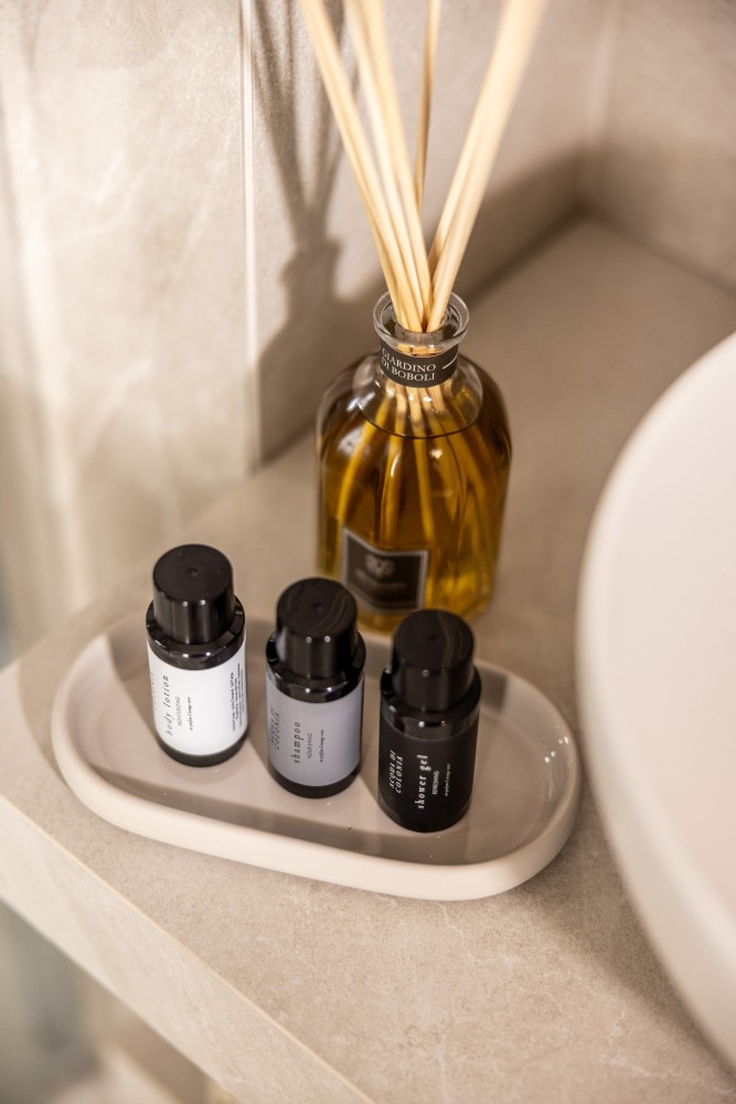 The private bathroom has: Large walk-in shower, bidet, Calacatta marble tiles, high‑quality amenities, professional hairdryer, slippers. Daily housekeeping service is included.