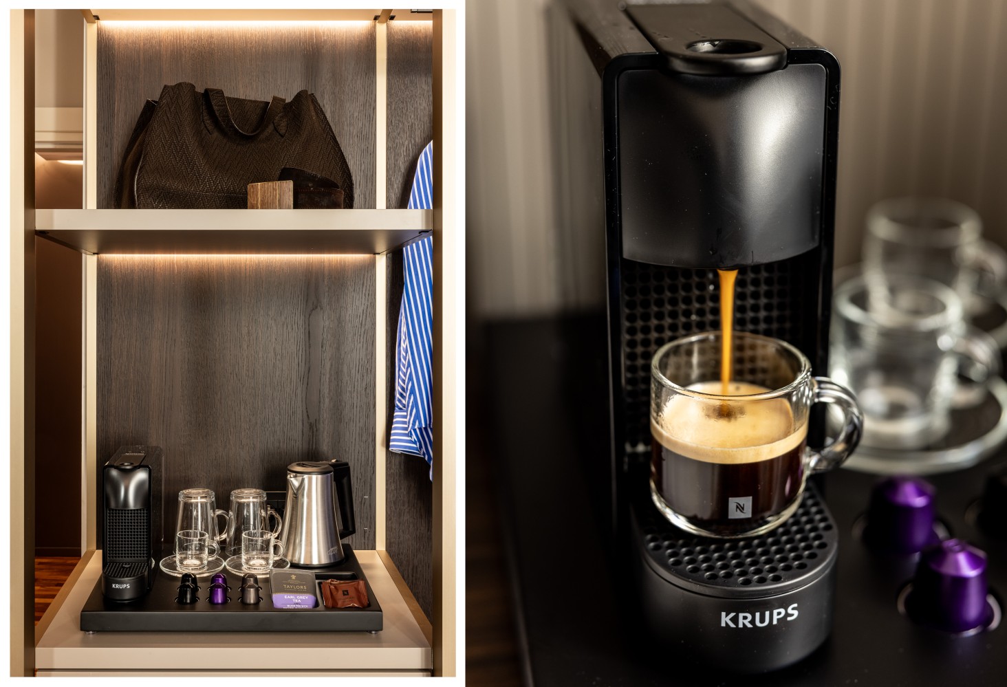 Each room offers: King-size bed (200 × 200 cm) with four pillows, 50″ SMART LED TV with streaming and international channels, Minibar, individually controlled air conditioning and heating, Soundproof windows, spacious safe for PC or tablet, kettle with courtesy kit, Nespresso coffee machine. Finished with parquet flooring, cutting-edge automation, and premium designer furnishings for a luxurious, functional, and inviting environment. Wi‑Fi 6E high‑speed connection.